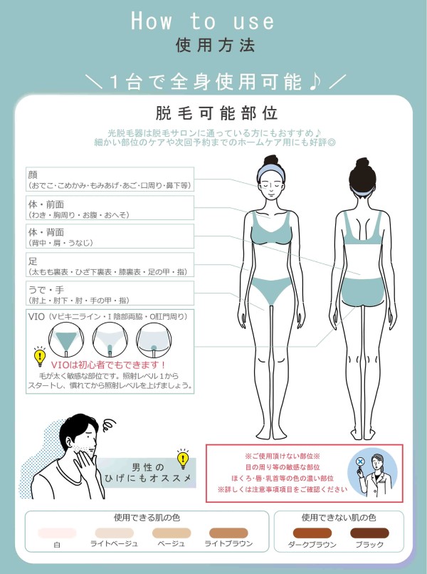 ただし顔のヒゲ、VIOゾーンは、ほかの部位よりも肌がデリケートなので慎重に最低レベルの照射からはじめて、ほぼ自己責任とした注意が必要のようです。