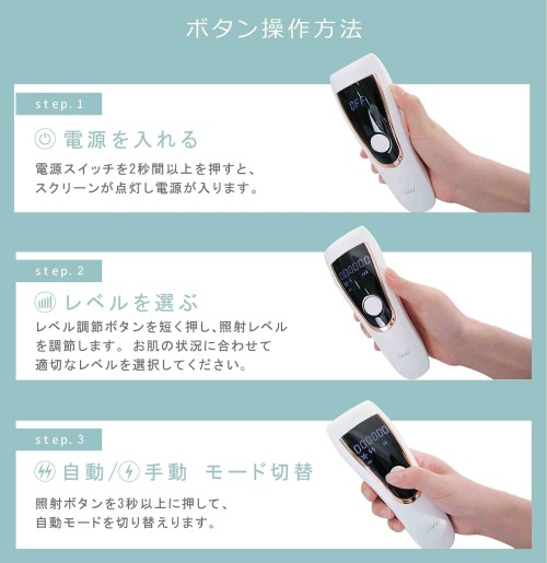 肌質や毛質に合わせて、フラッシュの照射レベルを5段階に調整することで、最適なケアが楽しめます。手動モードと自動モードで異なる部位に照射できます。
