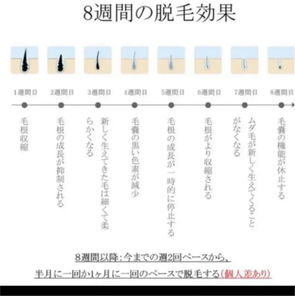 だいたい8週間後には毛が目立たなくなり、つるつるな肌になります。